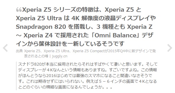 雖然規格已些許曝光,但還是要以 SONY 到時發表的正式規格為主!目前只能從曝光的消息推測 SONY 在 XPERIA Z5 上將投入大量最新技術,除了使用最新的 4K解析度螢幕之外,也將搭載最新的 Snapdragon 820處理器,在螢幕表現及效能上將有更大的突破,但曝光消息中並沒有提到電池電量是否提升,若維持原有的電池電量,再加上 4K 高解析度螢幕及高效能處理器的負擔,手機的使用時間可能會大幅縮短!至於作業系統版本,依照時間點來看,或許會使用 Android M 做為市售版內建版本。