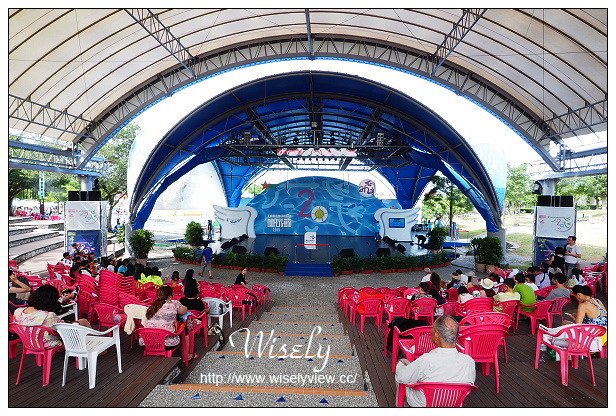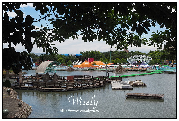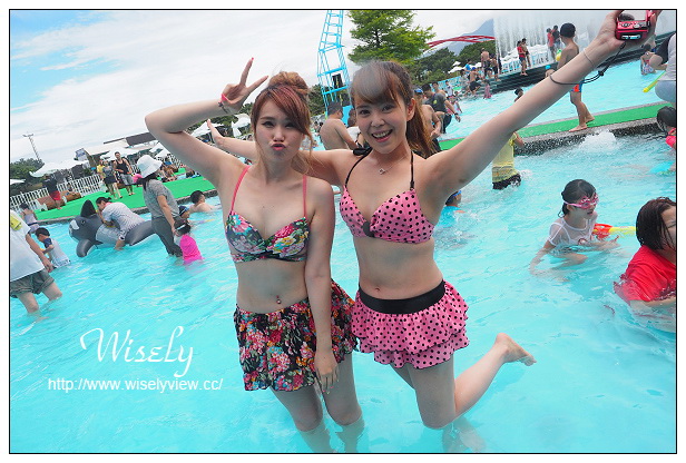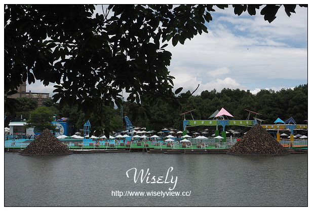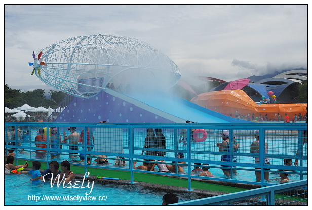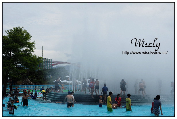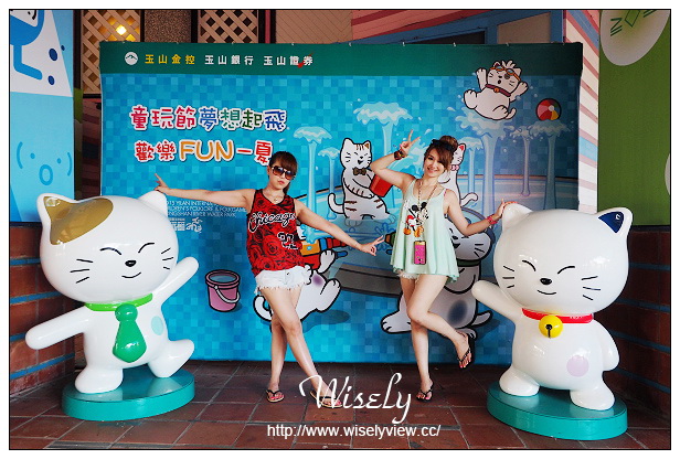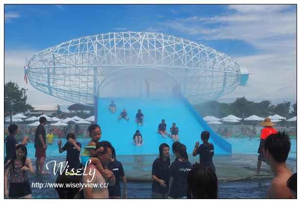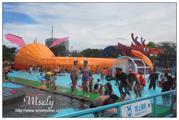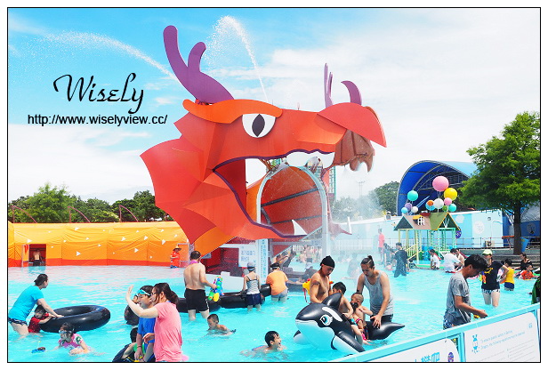 主要的戲水區其實跟往年都差不多,在休息座位區後方一帶有置物保管箱和換衣間等等,另外也有餐飲部在販售食品;除了有分類垃圾筒之外,也有工作人員不定時會來清潔整理。剛放暑假,目前來玩的還是親子家庭居多,但也有看到學校團體等等~這兩小妞愛美不想破壞造型,結果兩人都沒去排隊玩水上設施!Orz
