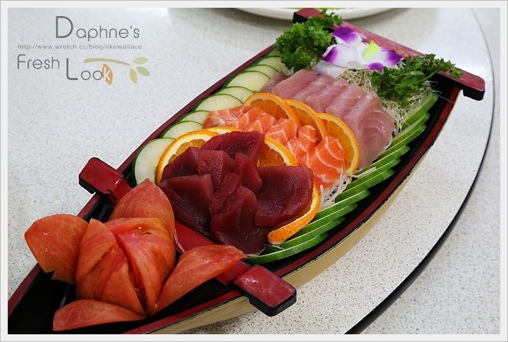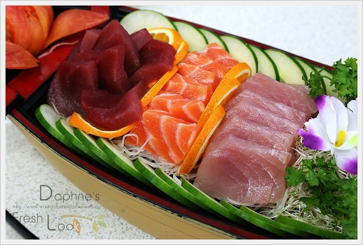 常見的生魚片三寶-有鮭魚、鮪魚、旗魚,擺盤細緻,從顏色最淡的旗魚開始品嚐,肉質細緻結實會回甘,鮭魚柔嫩油滑,鮪魚生魚片肉質甜軟,脂肉融合,附有芥末與醬油沾取。
