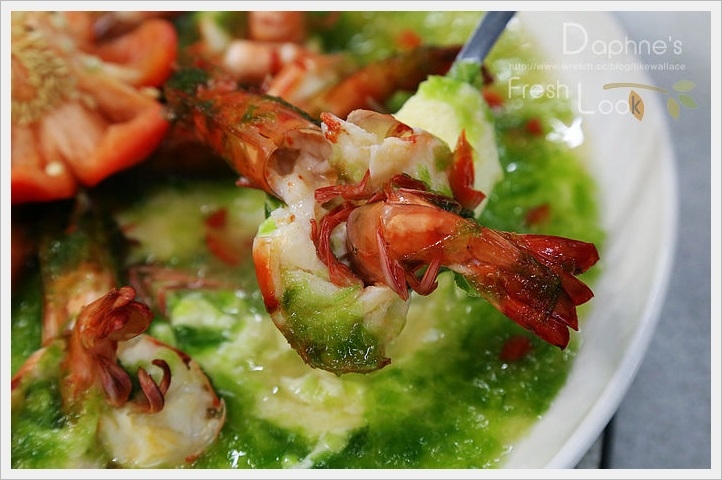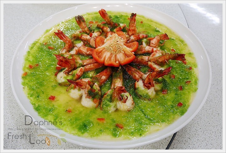 盤底以蒸蛋鋪底,蒸蛋入口即化,綠色湯汁清香稠滑,把蝦身切開露出微米色的蝦肉,蝦肉新鮮結實,與橘紅色的蝦殼相襯,配上翡翠,顏色相當好看,翡翠本來就常搭配海鮮煮,沒有過度調味蓋過蝦子鮮味的問題。