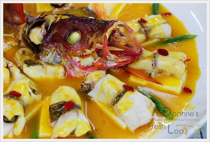 魚的擺盤處理有創意,用魚皮包綑住每一塊魚肉及嫩豆腐,佐南瓜醬汁,顏色亮麗。多人容易分食,一人一塊,不用像整條魚端上來,最後被夾得碎又爛。