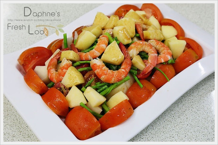 剛看以為是熱炒XD。用幾種蔬果拌佐和風醬汁的沙拉,加入幾尾新鮮去殼蝦子增添豐盛程度,醬汁酸甜香醇,彰顯各式食材的原味。