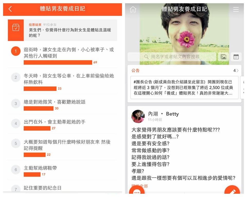 在「體貼男友養成日記」的 BAND 群組中,聚集了超過 2,500 個成員,彼此分享自己或身邊暖男的貼心事跡、如何成為或是養成體貼男友。一個網路熱議的話題在 BAND 上造成群聚效應,也讓這群人在此找到歸屬。