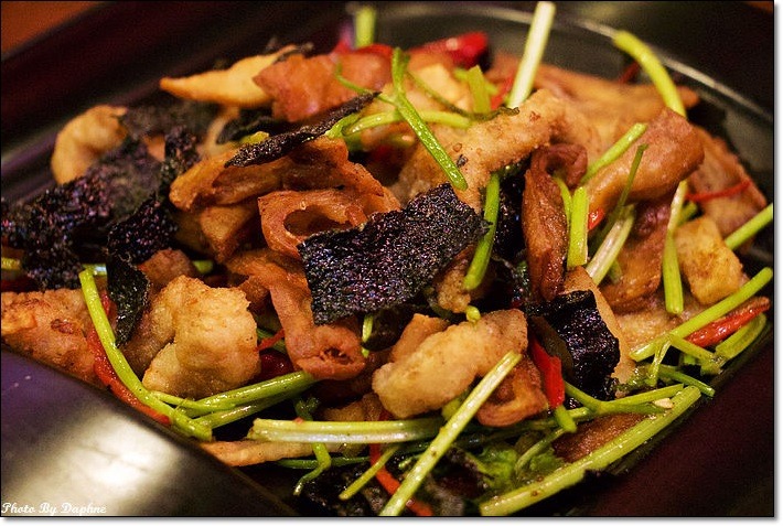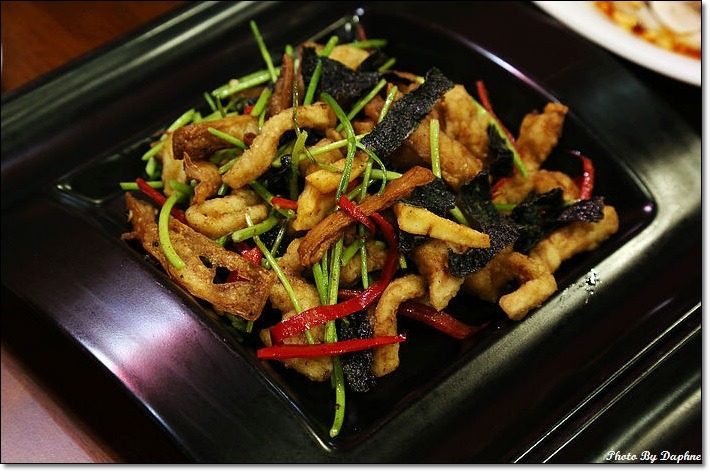 用乾扁的手法去料理,有瘦肉、肥腸與豆干,水份收乾,瘦肉、肥腸鹹香又Q,加一些海苔吃在口中就不會過於油膩,有點像乾版的客家小炒XD。