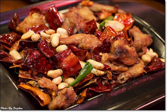四川菜之一,油炸過的雞肉加入辣椒、花椒拌炒,雞肉皮脆且薄,外脆裏嫩,焦香爽脆、辣椒、花椒的麻辣度可讓人接受,後勁也強。