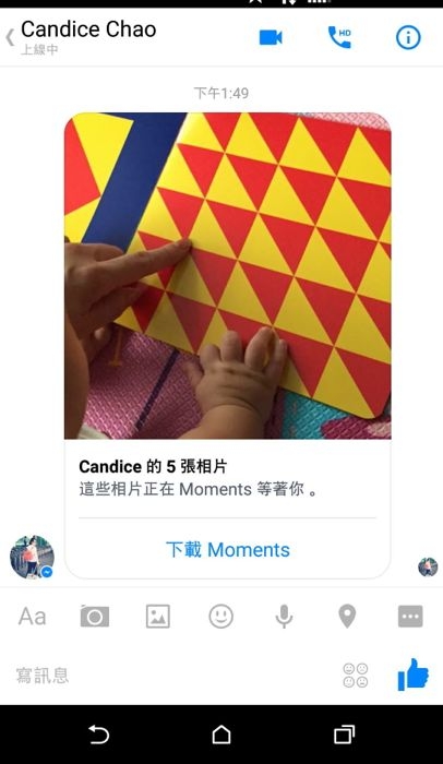 若是對方還沒有安裝 “Moments”,這些照片會在 FB 的 Messenger 中發出一則通知,來提醒對方下載 “Moments” 後進行照片瀏覽。