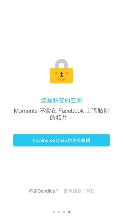 當下載完後,”Moments” 會要求我們使用我們的 Facebook 帳號進行登入。並且表示即便是登入,也不會將我們分享的照片顯示在彼此的 Facebook 塗鴉牆動態上。