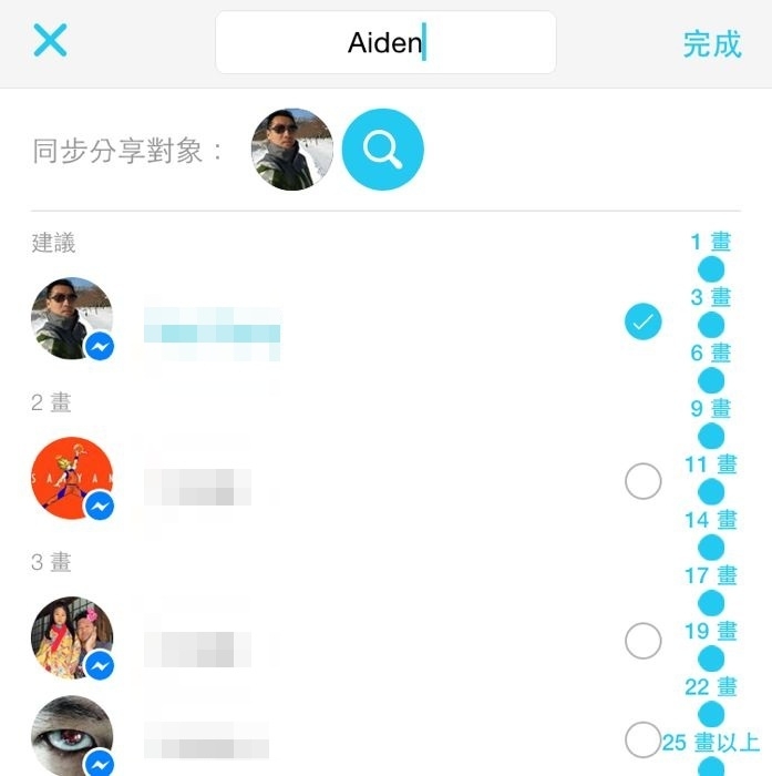 倘若我們想要進行分享,或是針對部分照片來分享,我們可以從我們的 Facebook 好友名單中挑選分享對象,甚至還能為這次分享動作設定標題後傳送。