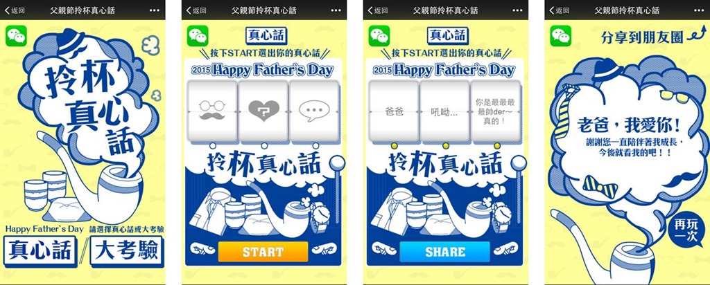 即日起,WeChat 用戶若選擇「真心話」按下 START 鍵後便出現拉霸,按下 STOP 鍵將會出現結果,畫面的左側將顯示對爸爸不同的親暱稱呼,中間欄位顯示內心的感覺,而最右側將有平常對爸爸說不出口的「真心話」