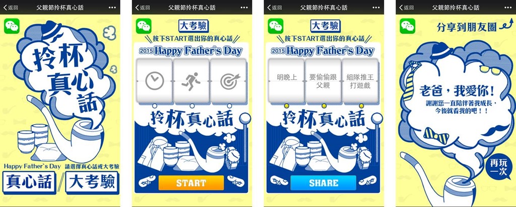 除「真心話」外,也和父親一起接受「大考驗」,按下「大考驗」後的 START 鍵拉霸便開始,按下 STO P鍵即會出現「大考驗」,畫面將顯示如: 起床後,打電話約爸爸吃我親手煮的飯等窩心趣味對話等,用時間、地點和動作的逗趣組合,增進互動,讓爸爸們擁有一個不一樣的貼心父親節。同時,真心話和大考驗的結果都可以按下 WeChat 右上角分享鍵,分享給好友聊天室或WeChat 朋友圈,邀請親朋好友一起挑戰 WeCha t父親節「拎杯真心話」大冒險。在這特別的日子裡,用 WeChat 傳遞對爸爸的關心與感謝,平日說不出口的「愛」,就交給 WeChat 吧!
