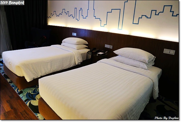 酒店共有 188 間客房,有的有陽台,有的沒有,Daphne 住的是 26 平方米豪華房,無陽台的房型,與公共空間的環境不同,房間像都會商旅的感覺。房內有40吋液晶電視、多功能辦公桌、免費無線網絡、HDMI 插座。