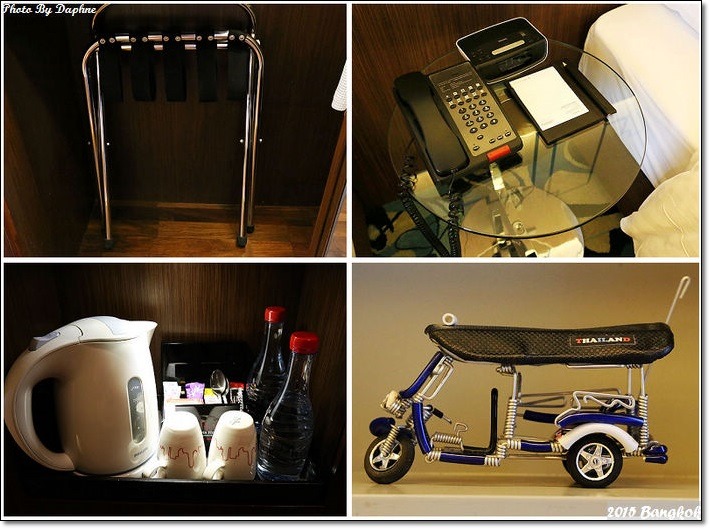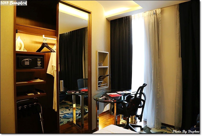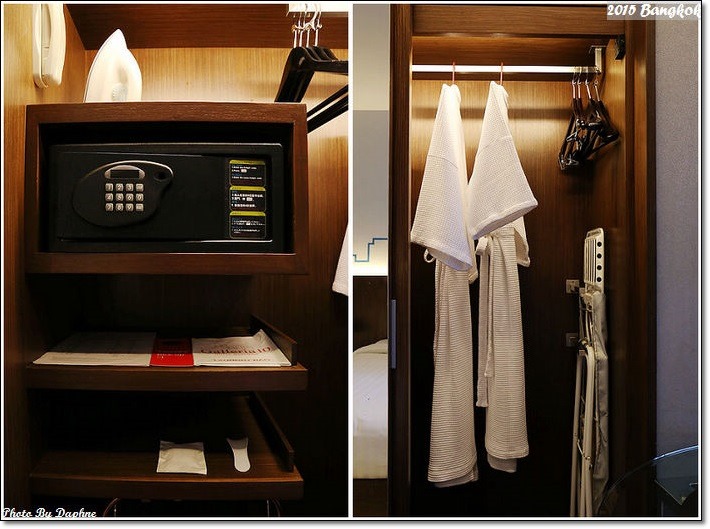 房間不大但設備齊全,有熨斗、燙衣板、行李架、保險箱、浴袍、電子鬧鐘…衣架有很多支。看得出來房間是以非常節省空間的概念在設計。