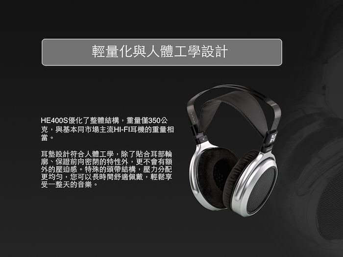 另一款中階機種 HE 400S 則是第一次在台灣亮相,相較於 HE 1000,除了 HE 400S 外殼材質稍微有差異之外,振膜也從奈米級改為微米級振膜,雖改為微米級振膜,但同屬於平面式振膜耳機,一樣不向劣質音質妥協。