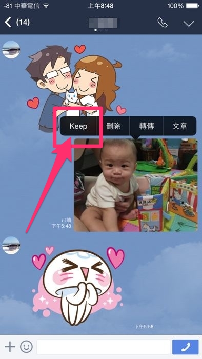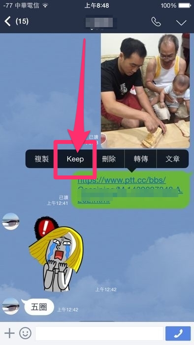 更新到 5.3.0,我們在看到與好友對話中喜歡的連結、照片等都可以直接按住,便會看到除了原先的”刪除”、”轉傳”與”文章”,還多了一個 “Keep” 的新選項。