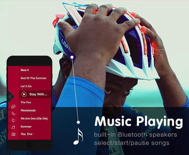 頭盔上的 LED 燈條可用來作音樂選擇/開始/暫停歌曲,在播放歌曲時 LED 燈條還會隨著歌曲節奏閃爍。