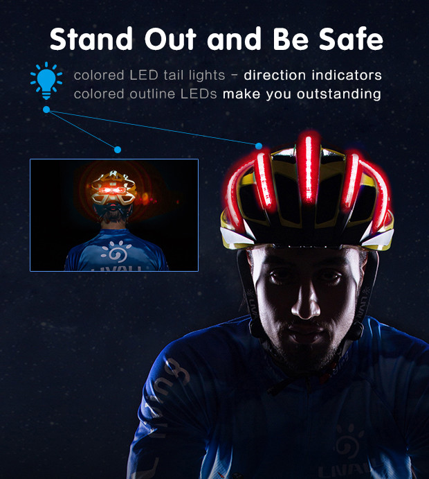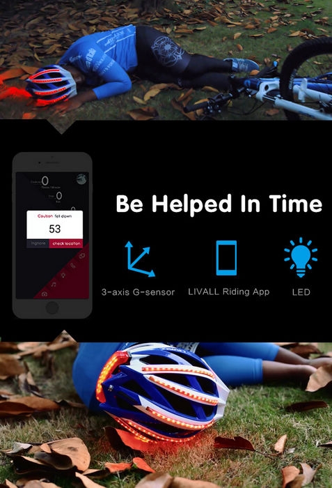 頭盔內建 3 軸重力感應器,一但它感應到異常的重力加速度時,在頭盔上的緊急信號警報將被啟動,並自動發送到緊急聯絡人。以免獨自騎自行車時孤立無援。