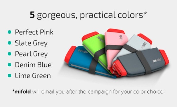 mifold 僅 750g,折疊後可放口袋,材質使用飛機級鋁合金聚合物製造,符合歐美規範,不因輕巧而造成安全打折,還可清洗,共五種顏色。indiegogo 上進行募資,最低入手價為 35 美金,預計 2016 年 3 月出貨。