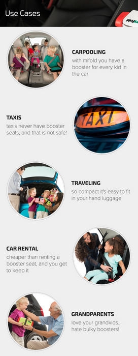 mifold 是為 4-12 歲兒童設計,與家用汽車安全帶搭配使用,把 mifold 置於汽車椅子上,讓孩子坐上去,安全帶往前拉,再使用三個卡扣扣住在肩部、臀部、腹部,以防護,即使小孩長得快也沒關係,以安全帶調整即可。