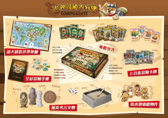 創辦人認為全世界絕大多數的博物館玩具、紀念品都是由塑膠製成,與現實中的文化寶藏樣貌完全脫節。然而,這些寶物之所以珍貴,就在於它的細節、質地、重量等特性。」因此,《世界冒險》的遊戲部件,講求考究,並以擬真化重現這些歷史文物玩具,例如兵馬俑(陶製)、米洛維納斯(瓷)、埃及黃金面具(金屬)、馬雅曆法碑(原木)等寶物,擬真又帶點迷你可愛,讓玩家親身體驗如博物館文物般最真實的觸感。這非靠團隊就能完成,而是結合台灣的設計、傳產、教育三大產業共20間廠商,以台灣獨特的陶、瓷、鑄金、木工等製程技術所製造,是多領域產業的集成,讓這些產業都能找到另一番新的出路。