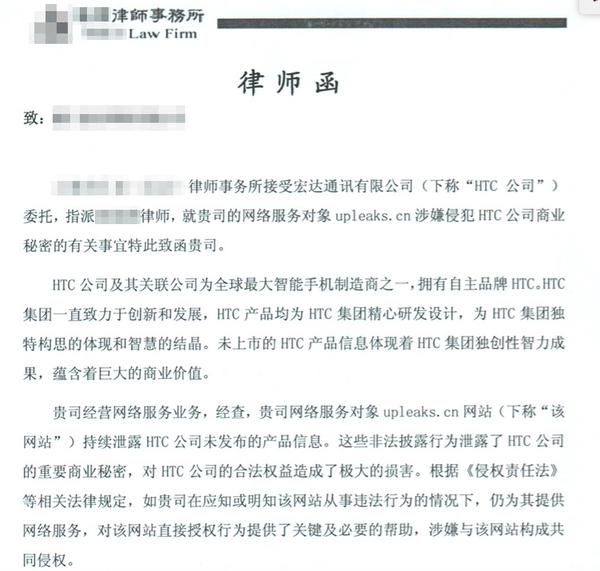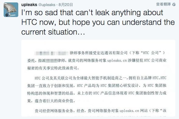 Twitter 中放上了由 HTC 發出的律師函,函中表示了由於該網站的不斷透露未上市產品訊息,為該品牌帶來了一些傷害。也因為此,該網站表示希望大家能理解他們將暫停透露任何 HTC 商品的消息。