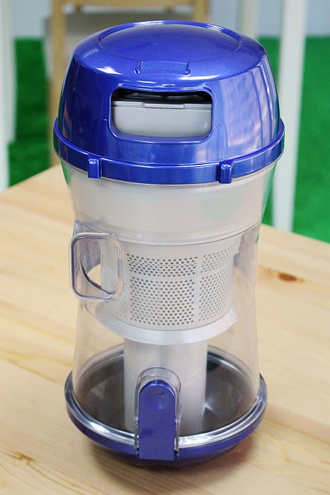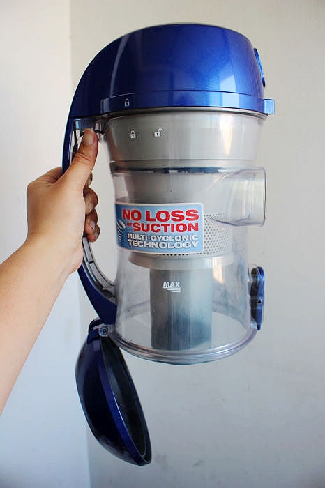 按下白色的開啟鍵讓粉塵,取出集塵盒內部的水洗濾網能單獨清洗,若想清洗集塵盒亦可,但一定要洗後徹底涼乾再安裝回機身。