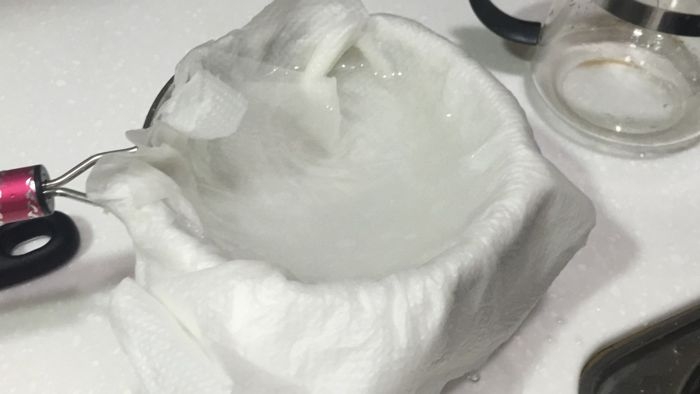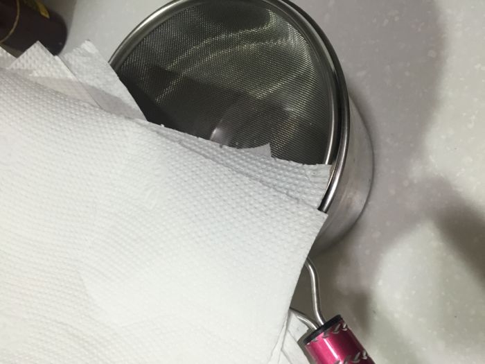 方法非常簡單,就是把 6 張餐巾紙鋪在篩網上,然後打開自來水龍頭讓水透過這層來過濾到下方的盆子裡。