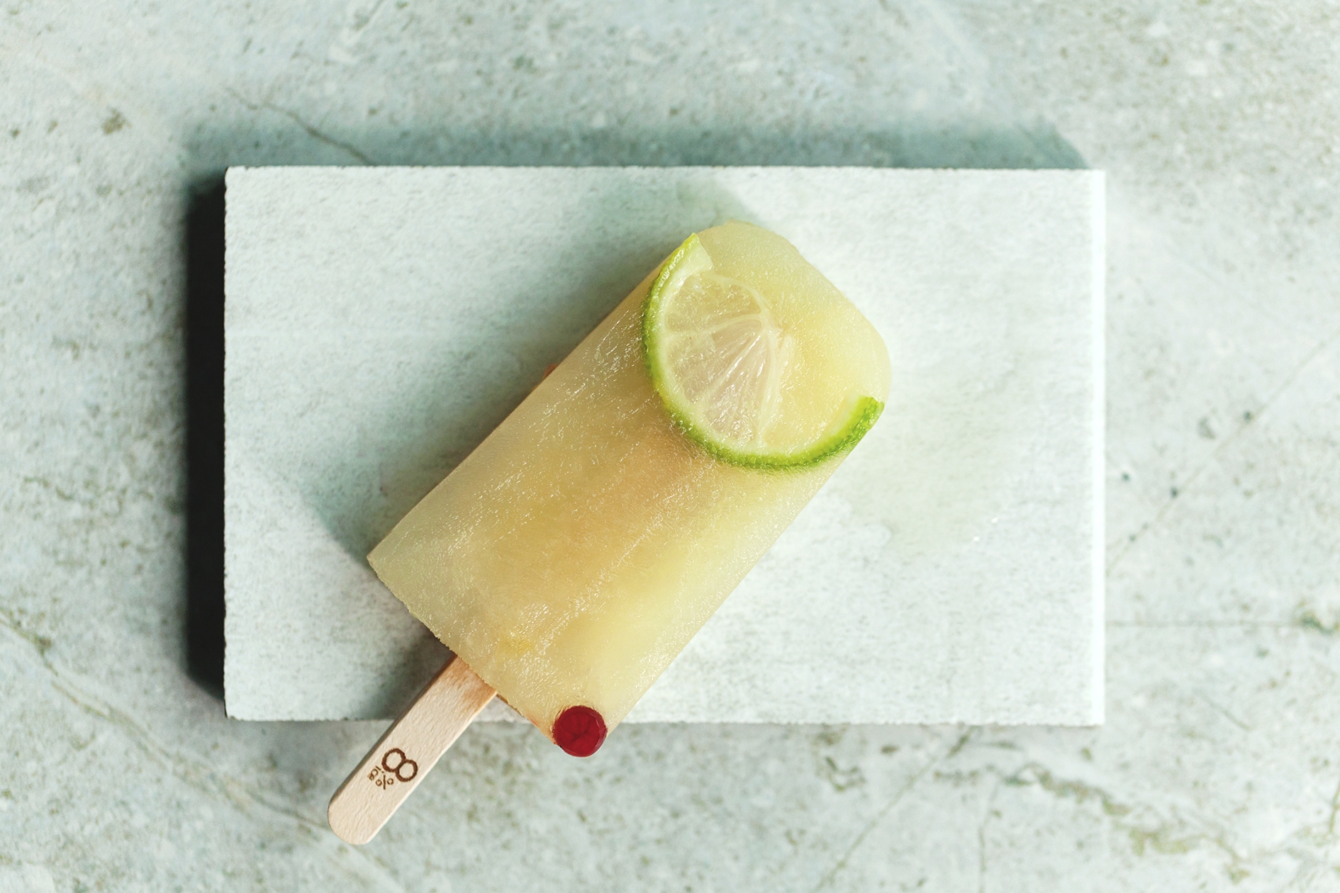 以活潑輕盈的檸檬氣泡水定調,搭配法國瑪瑟妮櫻桃白蘭地(G.E.Massenez)增添風味,櫻桃白蘭地採古法蒸餾釀製技術,篩選飽滿櫻桃果實,蒸餾前放入釀造桶內製成,帶有櫻桃微甜香氣;冰棒中若隱若現的嬌客,是選自台灣採摘的新鮮無花果,外型像水滴圓潤飽滿,果肉柔軟清甜多汁,佐一片檸檬片的柑橘酸味,挑起味蕾的無限精彩。