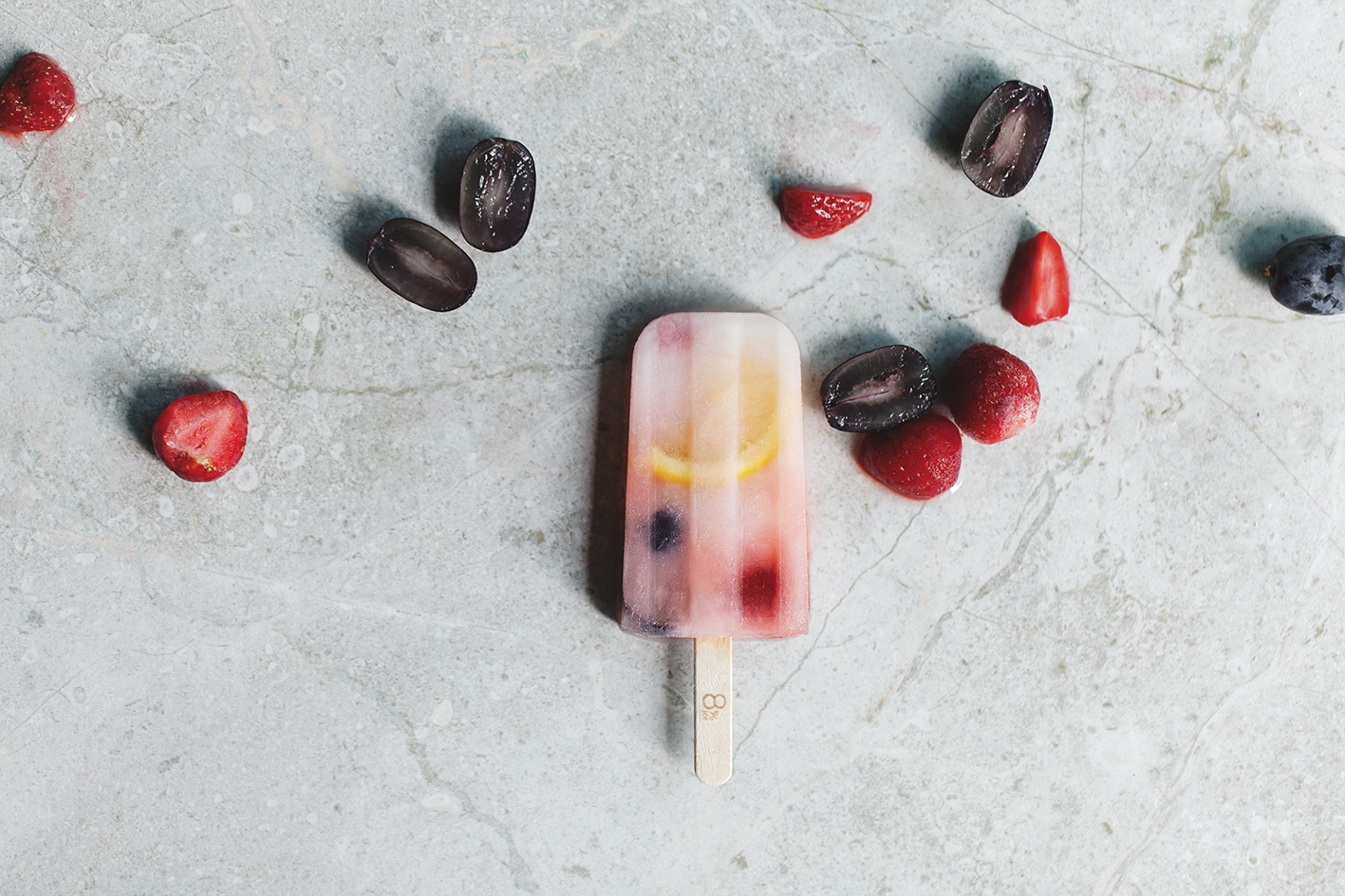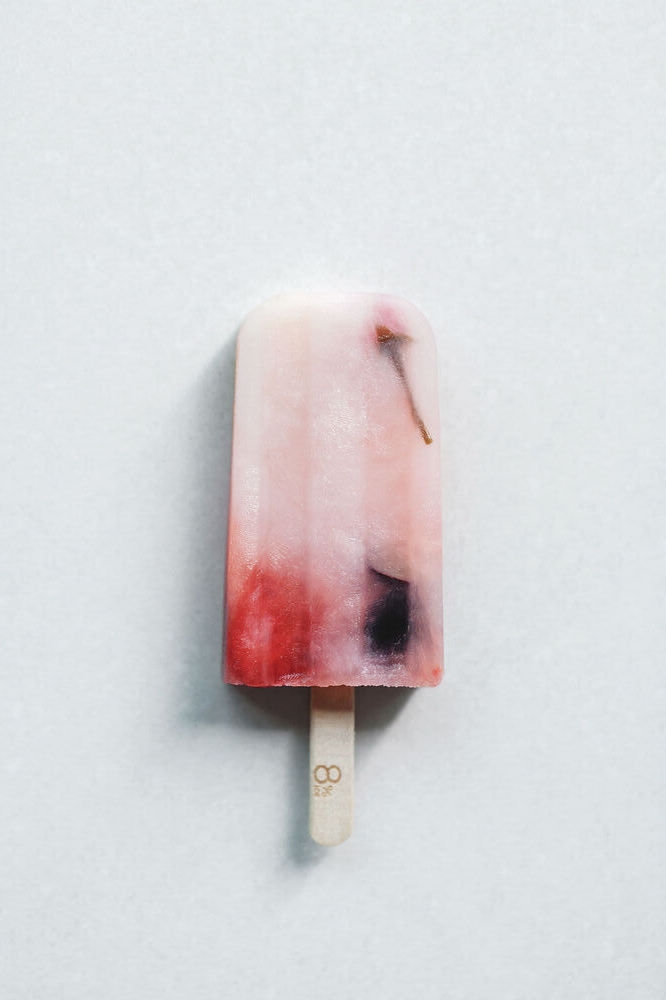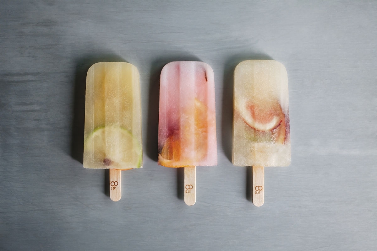 使用微酸微甜的日本可爾必思為基底,加入蘊含維生素C的水果,亮黃色的香吉士切片,釋放自然濃郁的柑橘香氣,鮮嫩紅潤的草莓,點綴在粉色朦朧的冰棒裡,香甜清爽有著不分季節的滿足感,錯落其中的紫紅色葡萄,與等待綻放的鹽漬櫻花,氣韻風雅細緻芬芳,美麗宛如初戀的滋味。