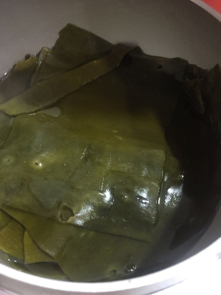 3) 昆布: 昆布取出用餐巾輕輕的刷一下或是迅速一下水把上面的雜質刷掉,但白色的粉狀精華可千萬不要刷掉唷! 接著剪成數片後浸泡 6 小時以上讓它軟化。
