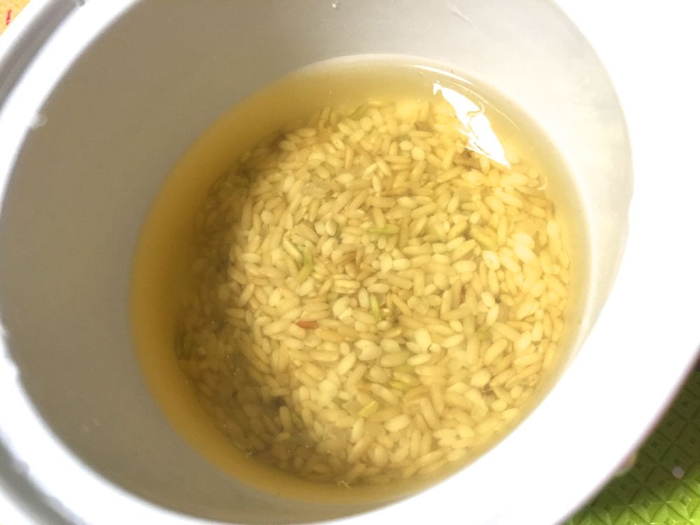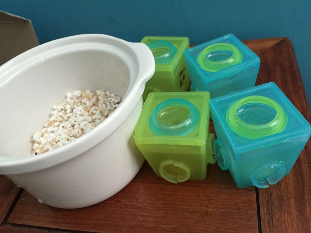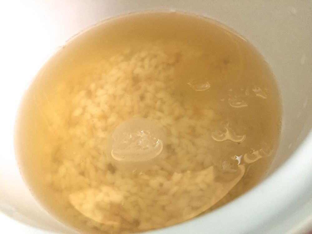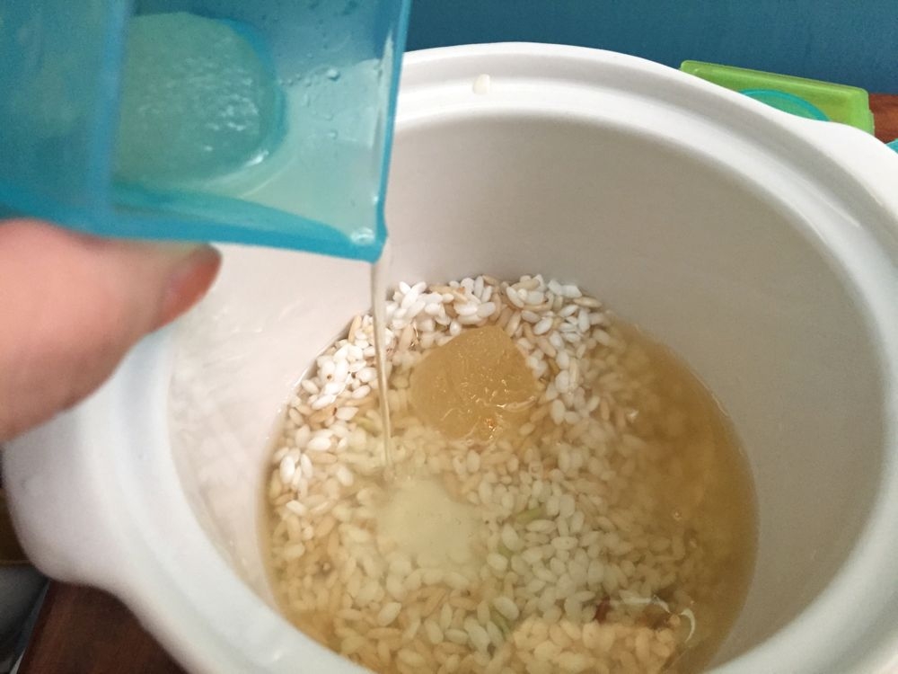 4) 等到這三個高湯都完成後,就可以跟洗好的米一起放進副食品鍋中慢慢煲。因為今天準備的是 5 倍粥,所以比例上就是 米 : 水 = 1 : 5,這邊米用 30ml,高湯也就準備昆布 70ml 紅蘿蔔 40ml 洋蔥 40ml 共 150ml 的高湯來搭配。
