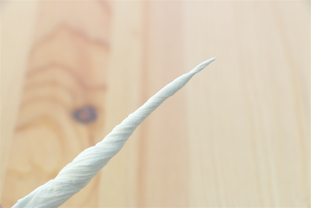 接著將衛生紙沿著邊角做旋轉的動作,就能轉出一條細長行得通條,這樣清潔工具就算完成了。
