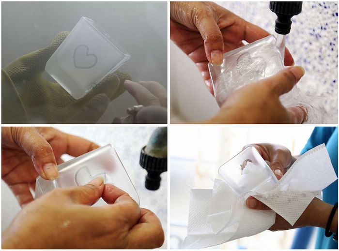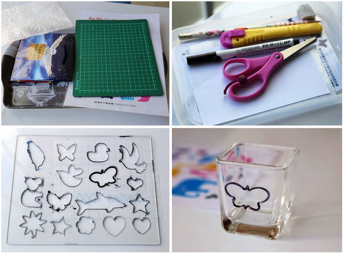 先在貼紙上畫五種圖案,可自創或用模板畫,再把五個圖案分別剪下,如貼貼紙般撕下背面貼上,再放入噴砂機噴砂,接著沖水,沖完取下貼紙,最後擦乾。