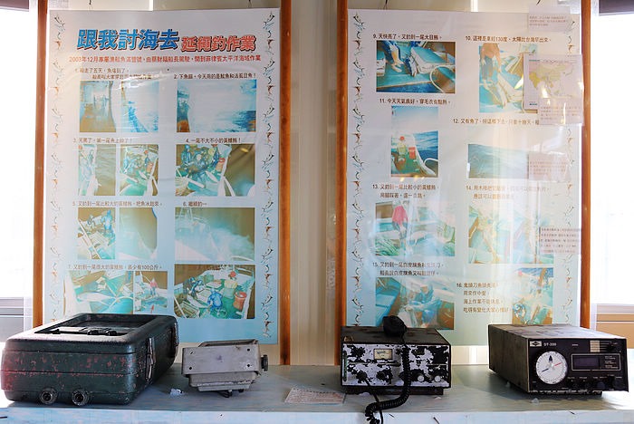 海上作業流程講解説及海上作業的設備展示,照片中是十多年前在太平洋海域的作業概況,漁民要看天吃飯,作業時更是沒有空檔休息,補獲魚的同時心裡都在想這可以賣多少錢?夠不夠一家子溫飽?真的非常辛苦。