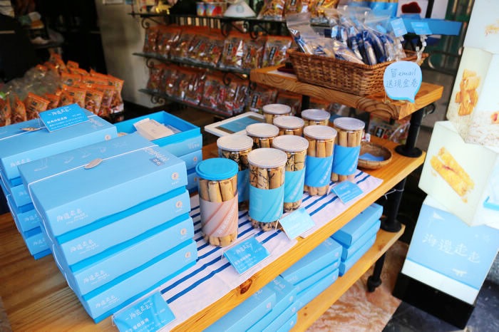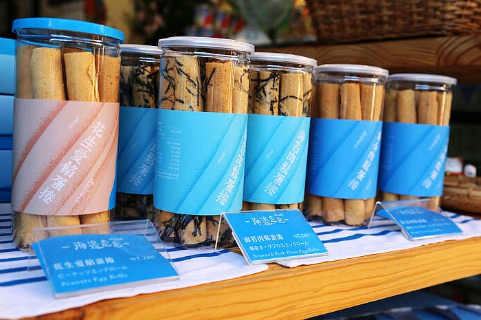 店內販售的另一系列產品並不是登峰的品牌,而是”海邊走走”,創辦人是資訊背景出身,在留學英國時遊歷了歐洲小鎮,愛上當地的深度文化及文創商品,回台工作七年後創立海邊走走,使用台灣本地食材的農產品、結合台灣插畫家、設計師、攝影師協作的品牌、並提供二度就業媽媽工作的機會,是有媽媽味道的手工蛋捲。
