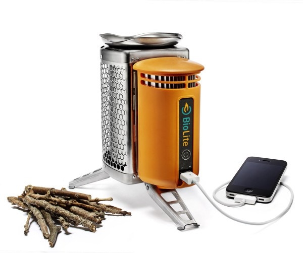 Biolite 行動烤爐一組有烤盤、蓋子、燃燒筒、一旁橘黃色的發電器,行動烤爐在燃燒時將熱能轉化為電能能量,比純使用木炭或木頭生火效率更高,產生電力可為小型電子產品充電。