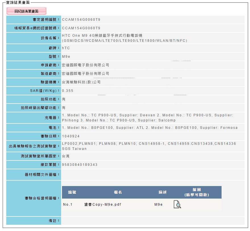 從這款 HTC One M9e 的審核證書中可以看到在今天 ( 9 月 24 日) NCC 正式審核通過 M9e 在台灣的上市資格,其中我們也可以確定支援台灣的 LTE 全頻段以及具備有 NFC 功能,而雖然審核資料中並沒有 M9e 的圖片或是更多規格消息透露,但根據之前坊間所有的爆料彙整, M9e 極有可能是使用 MTK 八核心處理器、2K 螢幕以及塑膠材質機身。