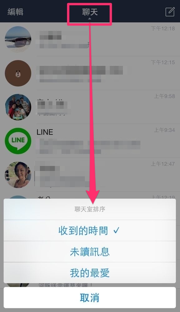 除此之外,LINE 也能讓我們依照使用習慣選擇對話顯示方式,分別有 “收到時間”、”未讀訊息”、”我的最愛”,來讓我們選擇想要的排序顯示方式。