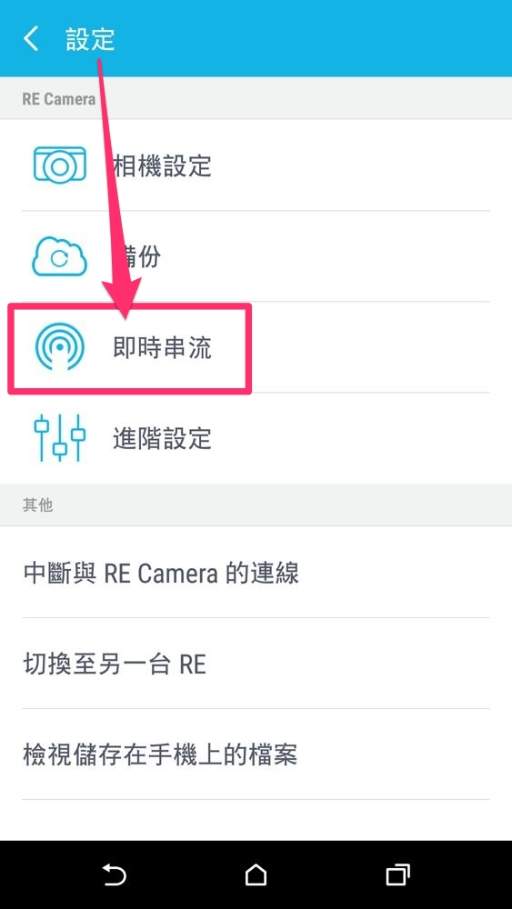 1) 首先進入 Re 的設定中,可以看到 “即時串流” 的選項,不要懷疑,就是它!