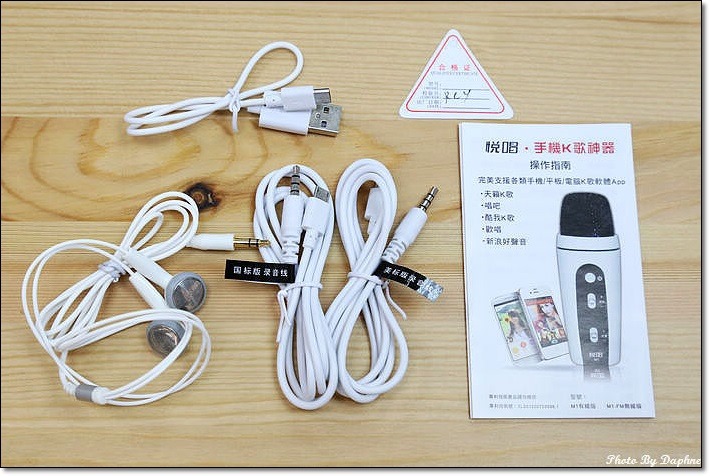內部完整配件有:K 歌專用耳機、Micro USB 充電線、國際標準版錄音線、美標版錄音線、檢驗合格證、操作指南。悅唱 M1 支援 iOS/Android系統的裝置,維需要搭配專用的錄音線,概括來說,Apple 廠牌的行動裝置是使用美標版錄音線,Andriod 系統的手機使用國際標準版錄音線,可是也有例外,HTC、VIVO 部份手機會是使用美標版錄音線,總之兩條都試試就對啦!