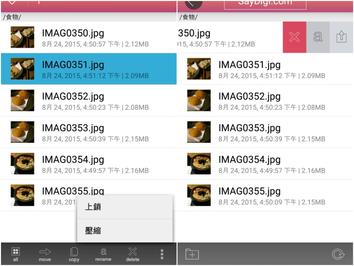 如果有一些比較重要的相片不想被看到的話,可以試試看右下角的上鎖功能。而右邊這張圖,則是可以對已經完成移動的照片進行刪除、重新命名及下載的動作。