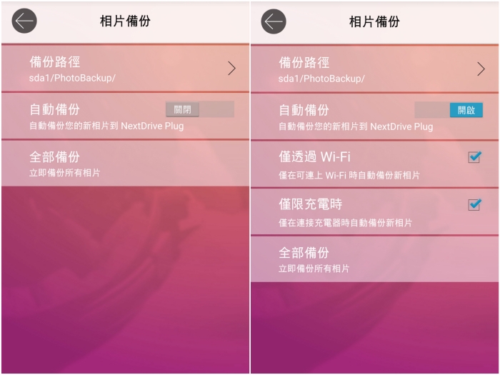 NextDrive Plug 無線擴充座除了一般的檔案存取之外,也可以設定將相片自動備份至 NextDrive Plug 無線擴充座中,而使用者可以自行調整要在什麼樣的環境下做自動備份,可以省下不少點選相片的時間。