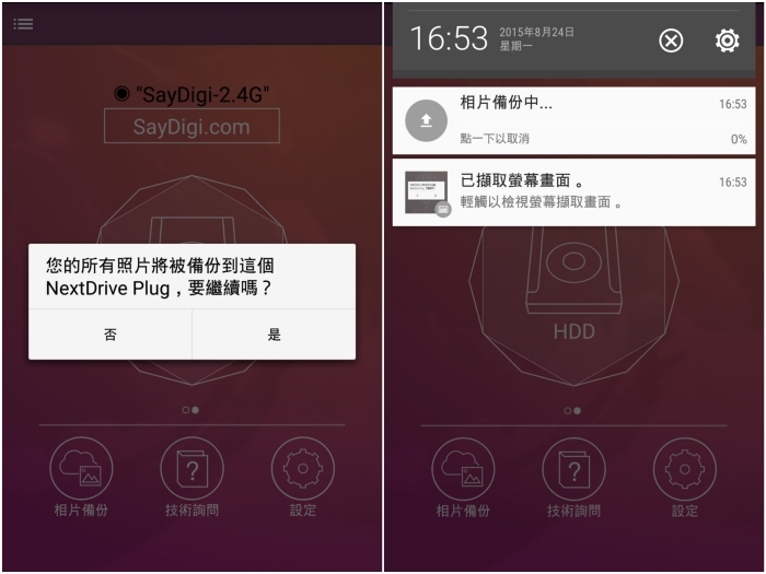 開始備份前,NextDrive Connect 會先詢問使用者是否要繼續,點選是之後就會開始進行相片備份。而備份進度都會顯示在手機的通知列當中,方便隨時注意進度。