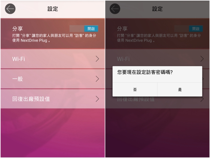 除了修改名稱之外,NextDrive Connect 也能進行分享,只要將設定中的分享開啟,就能同時與家人或是朋友一起共用 NextDrive Plug 無線擴充座內儲存的資料。也可設定訪客密碼來增加資料的安全性。