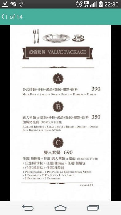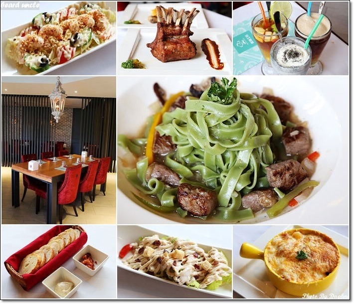 餐點分為單點及套餐,單點的種類有:各式排餐,售價 250-350 元間,義大利麵 99-189 元間,燉飯 139-250 元間,義大利麵與燉飯加焗烤多 30 元;前菜 50-70 元間,甜點均一價70 元,飲料 50-150 元間,均收一成服務費。另有最划算的超值套餐供選擇,既然來了就全吃一輪比較划算!餐點的量不是多到會吃不下,建議點套餐。