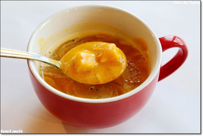 南瓜濃湯是上桌前會注入一點鮮奶油提味,而不是一開始在熬煮時就加入,基底仍以南瓜為主,湯底深黃夠味,一看喝就知道是取熟甜的好品質南瓜打製成。