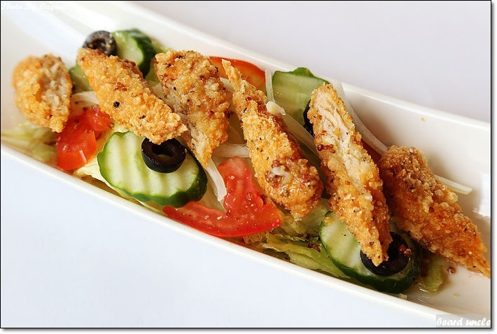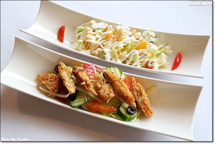 這一道要趁熱吃,使用帶檸檬香氣的雞柳條切塊,底下鋪了生菜、小黃瓜、蕃茄等蔬果,並有加一點特調的酸甜醬汁,沾著吃,油膩感減輕很多。