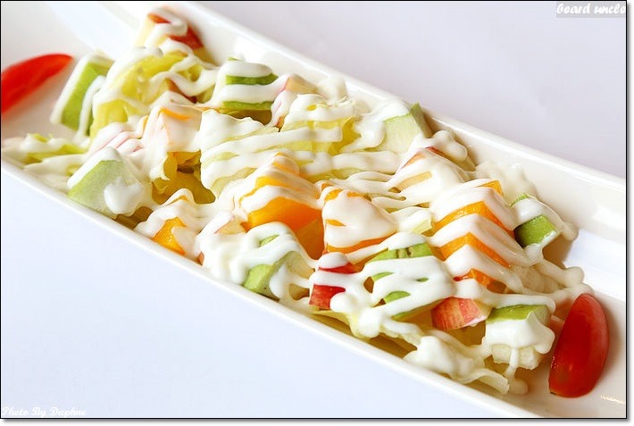 沒有搭大大片,讓女孩吃時還要張大嘴的生菜,全都處理好了,加了生菜與數樣水果點綴,淋上優格醬,蔬果多汁,優格醬讓人大大開胃。