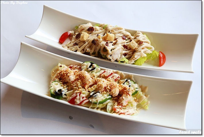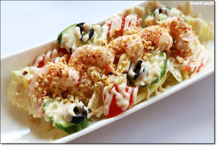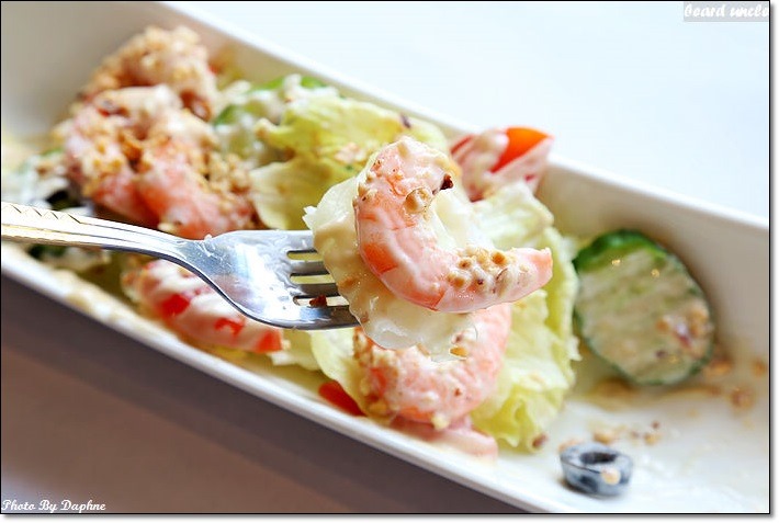 把蝦子貼心去殼擺一排,灑上堅果粒,淋上柚香沙拉醬,淡雅清新,有時吃別家的義大利麵都不見得能吃到五尾蝦子,人家一盤 70元的沙拉就放了五尾,即使不談成本,這樣的比例已經夠誠意了啊!