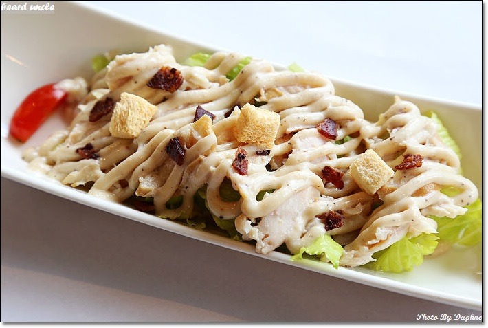 與麵包使用一樣的凱薩醬,完整覆在雞肉片上,底下一樣鋪了生菜,有菜有肉,吃的豐盛。