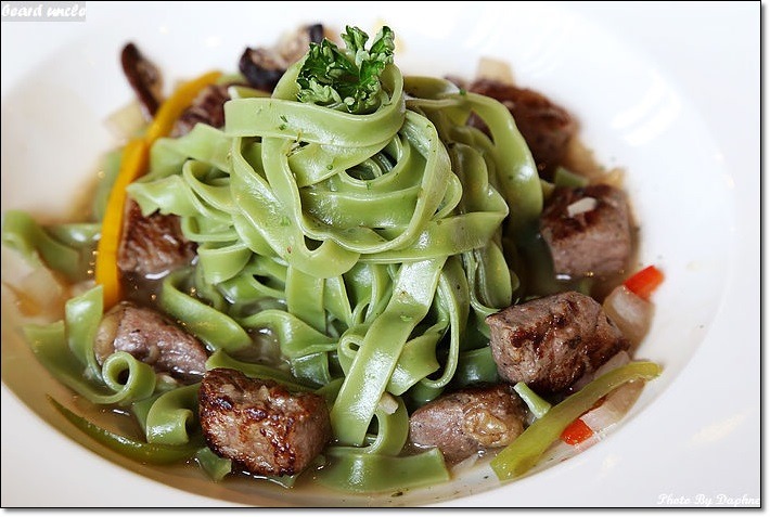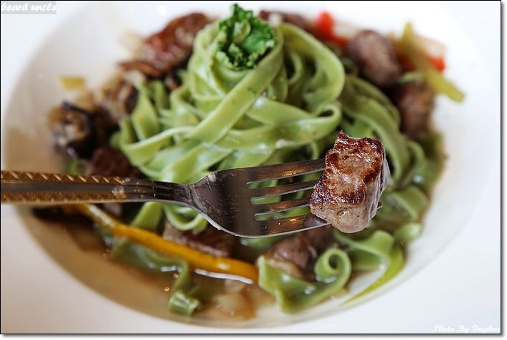 因為太喜歡吃寬麵,又選擇波菜寬麵搭配,放上數塊香煎的霜降牛肉,霜降牛肉油花多,入口即化口感嫩,感覺還有一點蒜味?波菜寬麵彈性好,味道青香,麵身又透軟。